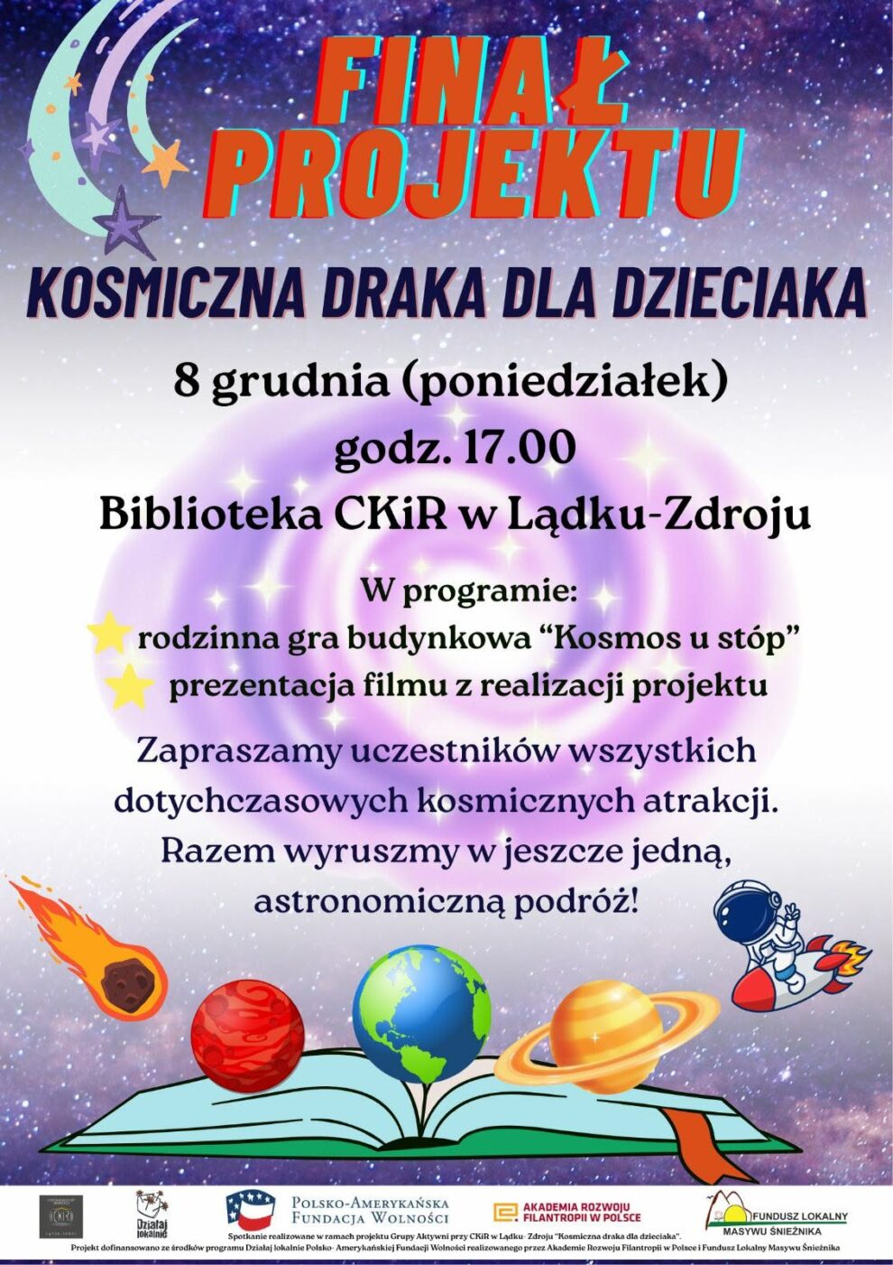 I to nie raz i nie dwa! Bo tak ciekawie działo się w naszej bibliotece przez ostatnie 3 miesiące za sprawą realizacji projektu “Kosmiczna draka dla dzieciaka”, dofinansowanego ze środków programu Działaj Lokalnie Polsko-Amerykańskiej Fundacji Wolności realizowanego przez Akademię Rozwoju Filantropii w Polsce i Fundusz Lokalny Masywu Śnieżnika.